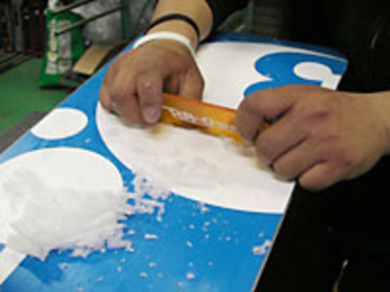 | ワックスを伸ばしたら、すぐにスクレパーを使ってワックスを剥ぎ取ります |