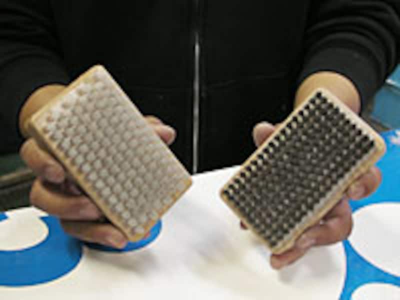 | 左がナイロンブラシ、右が馬毛ブラシ。毛の太さ、硬さが違います。 |