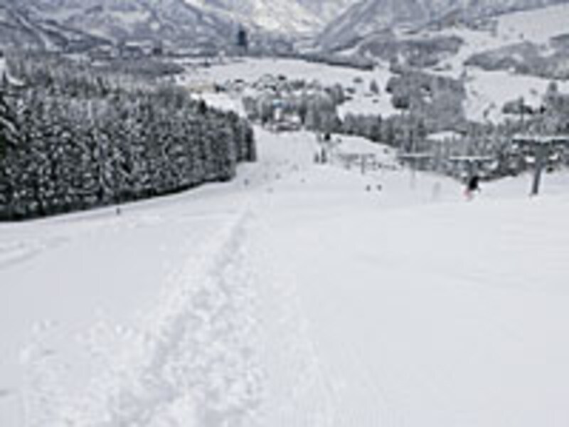 | ちょっとわかりづらいですが、写真の右側にはキレイに圧雪されたコースが広がり、左側のコース脇には未圧雪のパウダーが残っている。ここがパウダー入門者におすすめの場所。 |