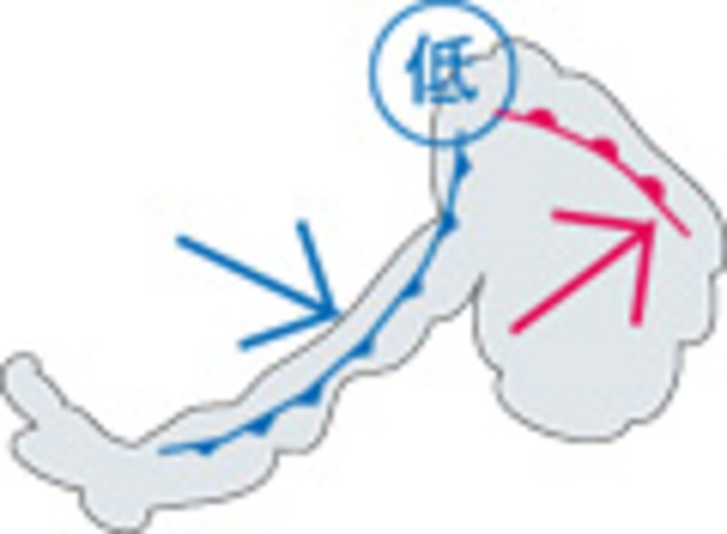 北半球の低気圧では、渦を巻こうと している段階=発達中に、反時計回りに 強く風が吹きます。 |
