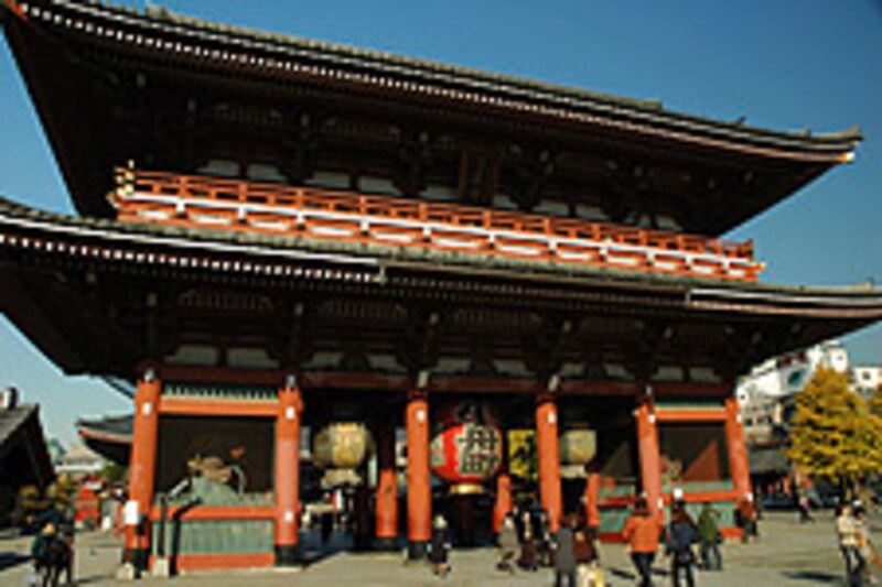 | 仲見世通りを抜ければ、浅草寺。どーんと門が鎮座する |