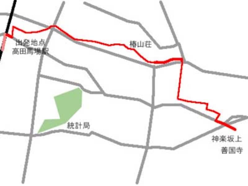 | 高田馬場を出発して、ひたすら神田川沿いを歩く。やがて江戸川橋に着けば、もうまもなく神楽坂。普通に歩けば、約50分程度で終了するコース。春、神田川沿いの桜がきれいなコースでもある |