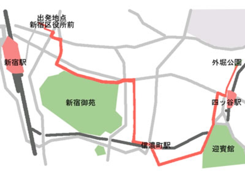 | 新宿ゴールデン街を出発し、目指すは四谷。新宿御苑のそばを通過し、外苑西通りに近い裏道に入る。そこから一気に信濃町まで。権田原坂を下って鮫ヶ橋を通過し、鯛焼き「わかば」まで、普通に歩けば約1時間の散歩コース。都心にいながら、その静けさには街を感じさせない不思議な散歩だ |