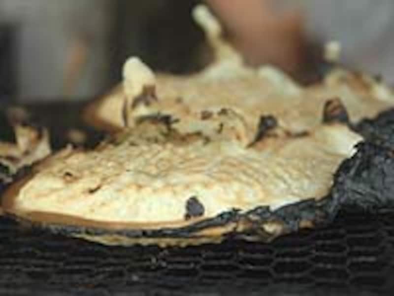 | (上)おやじさんの職人芸がきらりと光る! (中)できたての鯛焼き。焦げた部分は丁寧に取り除かれます (下)熱い!あんこの粒がしっかりわかり、甘さ控えめ。うまい! |
