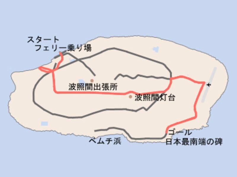 | 島は名のとおり珊瑚礁で囲まれ、東西6キロ、南北3キロ、周囲14.8キロと、とても小さい。自転車であれば、1時間強あれば周囲をぐるりと回ることができてしまう。歩いて回るなら、半日はかかる。何もないので、事前に水分は購入しておこう |