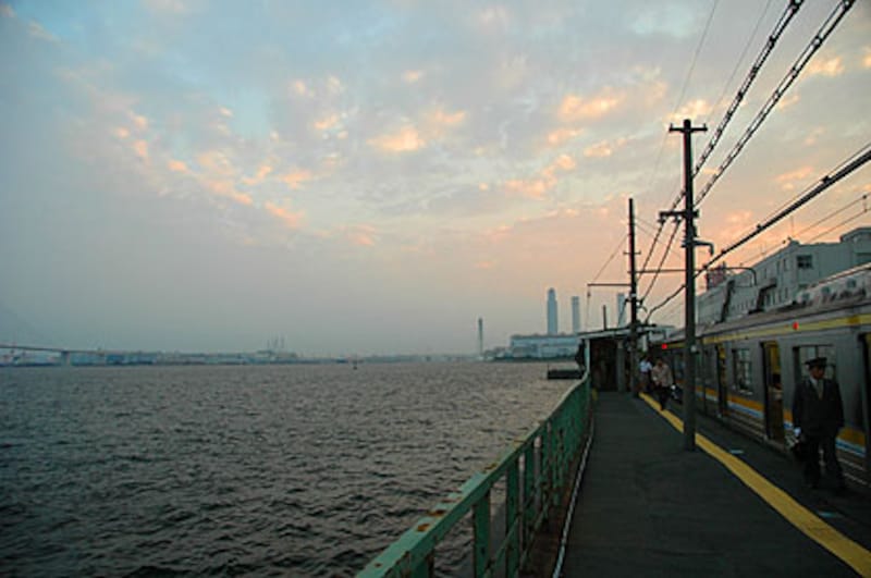駅に到着。確かに海の上にホームがある感じだ。海の向こうは京浜工業地帯の象徴、コンビナート群が夕闇にぼうっと聳え立っている。Nくんはホームで写真を撮っている。東芝の人が電車に乗り込み、本格的なラッシュが始まりだしたようだ。