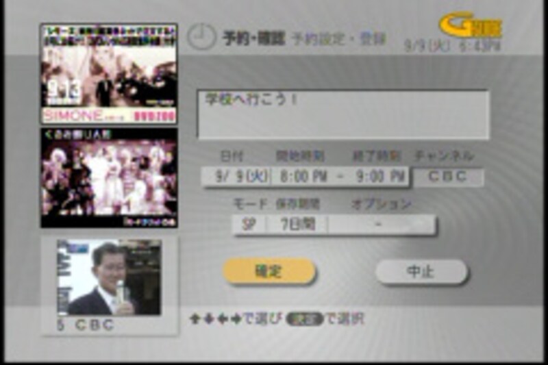 | さて。準備が整ったところで早速コクーンの録画機能を試してみましょう…といいたいところですが、実はこのままでは使えない重要な機能があります。それはEPG(番組表)です。EPGに対応しているHDDレコーダーならば、テレビ画面で番組表を見ながら録画予約をすることが出来るのです。 EPGを使用するためには、一日数回特定の放送局から送信されるデータを受信する必要があります。受信はコクーンが勝手にやってくれるのですが、設置したての状態では番組表がカラ。なので、放送局からのデータが送られてくるまではEPGが使用できません。 もちろん時間を設定しての番組予約などもできるのですが、やはりEPGを試してみたい! PSXにも搭載されると言われているEPGを試してみないことには! というわけで受信まで一日待つことにしました。 ![]() 番組表を受信すると、メニュー画面から番組表を見ることが出来ます。チャンネルごと、時間帯ごと、ジャンルごとに見ることが出来ます。 普段は時間帯ごとの番組表がオススメ。新聞のテレビ欄ほどの一覧性はありませんが、好みの番組がないかどうかを眺めながら、気になる番組をすぐに予約できるのは非常に便利です。これだけでテレビがグッと近くなるかも! ![]() そして何気に便利なのが、チャンネルを変えたときに番組名が表示されるということです。今まではチャンネルを変えてもCM中だったりして、すぐにどんな番組かわからないことがほとんどでした。が、コクーンを導入すると変えた瞬間に番組名がわかるので、目的がなく「いい番組ないかなー」なんて時にはとても助かります。 |