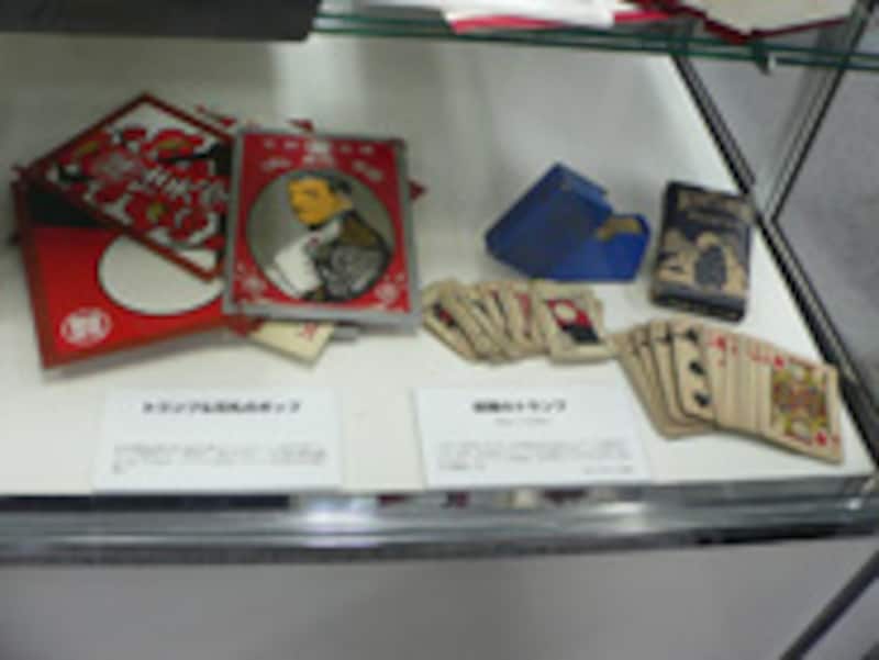| 花札のポップと、紙製のトランプ。輸入に頼っていたトランプを初めて国内で製造した。(※画像をクリックすると拡大表示します) |