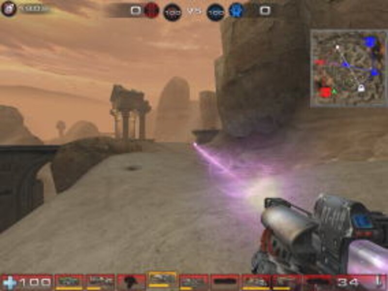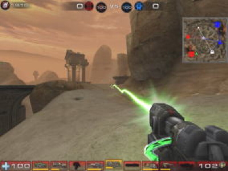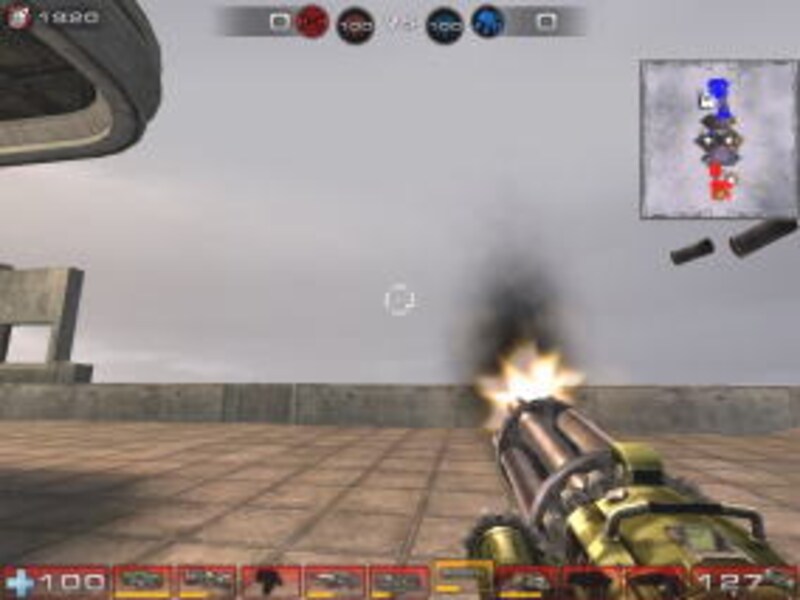 | Minigun ミニガン 決して小さい銃ではありません。いわゆるガトリング砲というかバルカン砲ですね。見た目は巨大な砲塔のようですが携帯向きなんですね。銃口を向けた方向に銃弾を連射します。長距離には不向きですが接近戦になると効果があり連続して相手にダメージを与える。UT2004では相手も動きまわるので、こうした照準をきっちりと敵に合わさなくても銃口を向けて撃てば強力な武器に・・・。 |