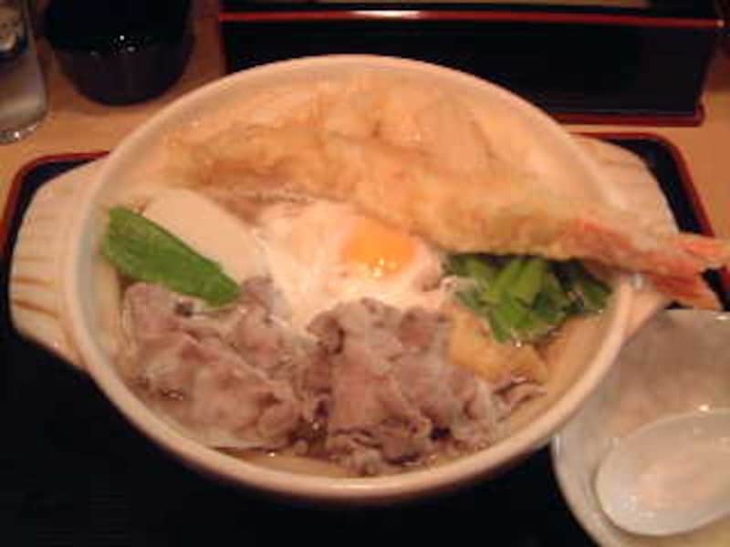 このうどんで作られる鍋焼きうどんは2300円。巨大な海老天と蒲鉾や揚げ餅などたくさんの具が特徴。薄味のつゆがまた美味いこと。