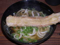 あつかけ湯がいたうどんを受け取りてんぷらはちくわ天、ネギと生姜を載せたら自分でダシを注ぎます。こちらもうまいです。うどんはともかく、ダシがうまい。(笑)・・・うどんも美味いんですけどね。