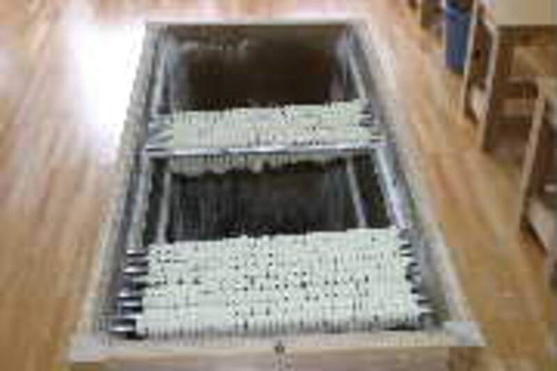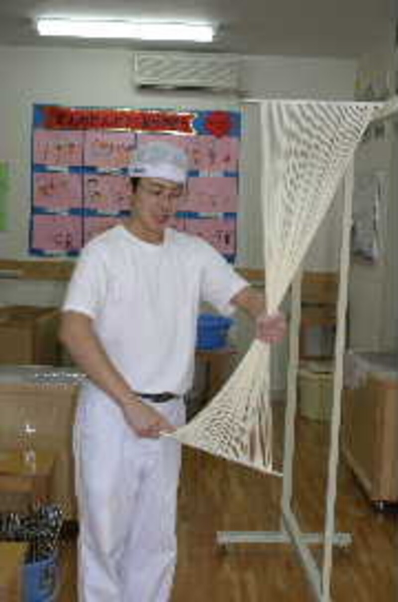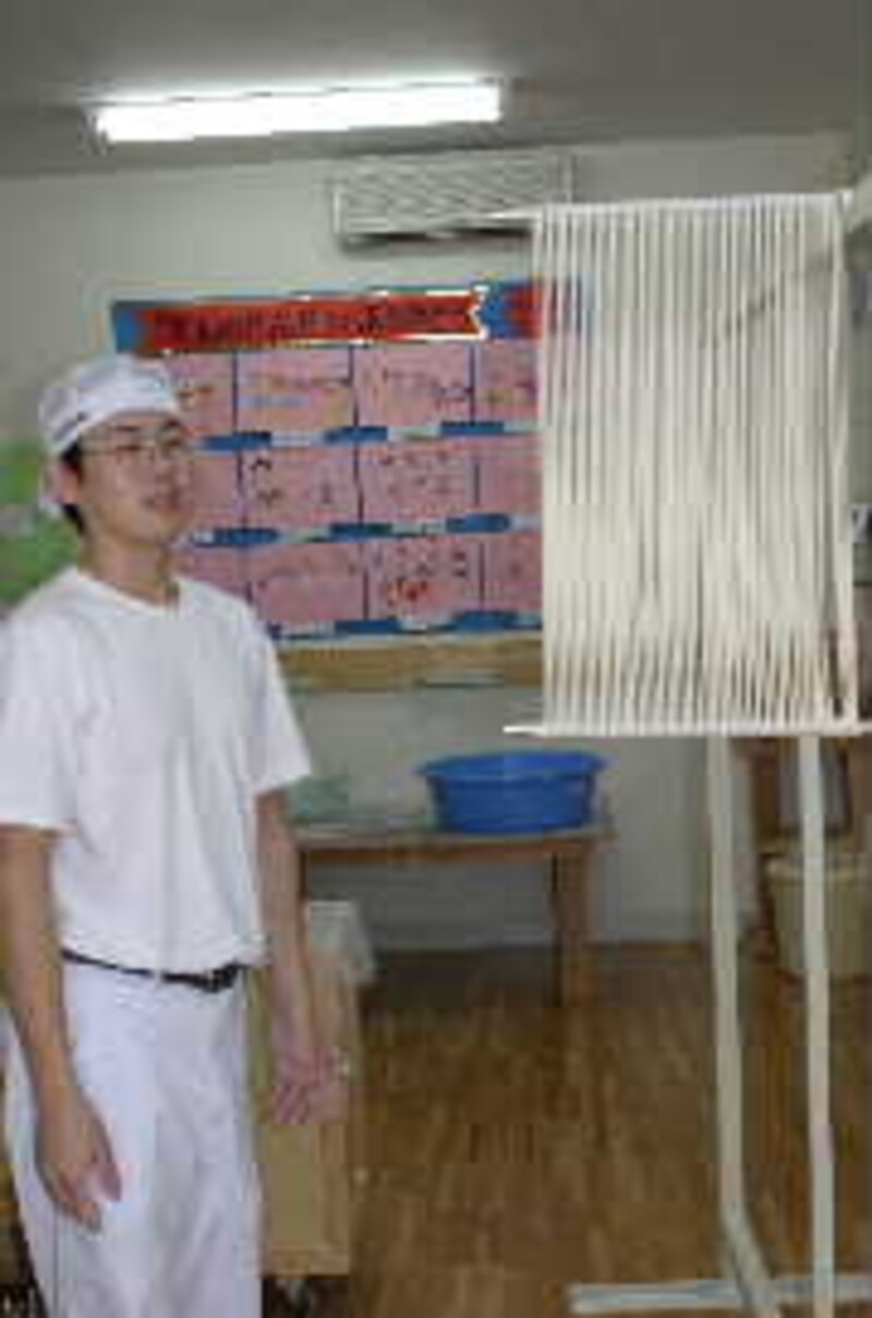 棒を引っ掛ける金具が付いた台に片側の棒を固定して引っ張って延ばす。強い弾力を感じる。ゴムを延ばしたような生地の強さはちょっと驚きである。ここにでんぷんを振りかけて麺棒でつぶす。丸かった断面が四角くなる工程だ。隙間に手を入れて一本一本が離れて打ち粉がまわっていることを確認する。また熟成用の箱にいれて寝かす。