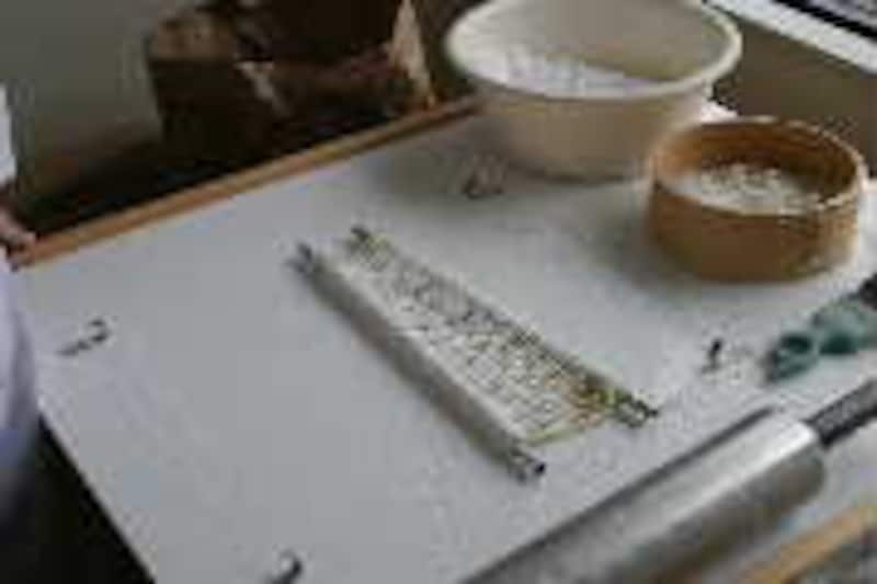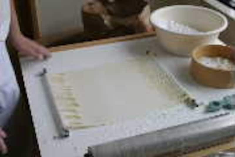 9 つぶし 打ち粉(でんぷん)をかけてローラーをかける。生地が伸びて平らになる。
