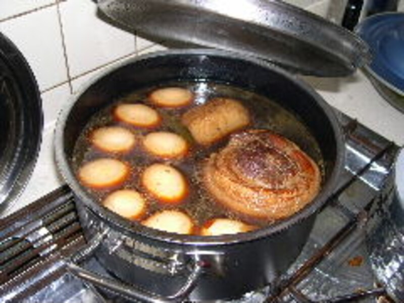 (写真は別の鍋で仕込んだバラ肉のチャーシューに入れた味玉)