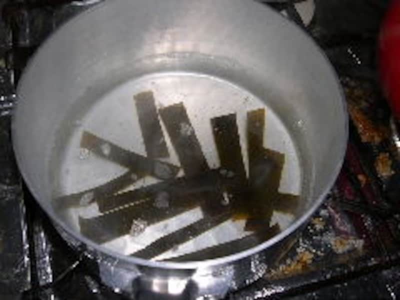 ●昆布を2センチ*5センチ幅程度の短冊に切り鍋の水に入れておきます。