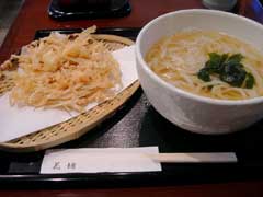 京うどんとなればやはりおダシのよさを味わいたい。温かいうどんで試せばやはりきつねうどんだろう。昆布と鰹節の風味と味醂の甘さが効いたダシは少し疲れた体に優しい。夏でも冷房で冷え気味の体調には嬉しい温かさかもしれない。胃にやさしそうなうどんとふっくらした油揚げの組み合わせは温かいうどんメニューの一押し。ゴボウと小エビのかき揚げが別皿でつくかき揚げうどんも人気。ささがきゴボウの香高い、さくさくのかき揚げはいつでも揚げたて。