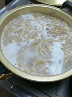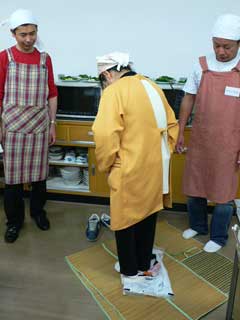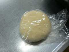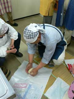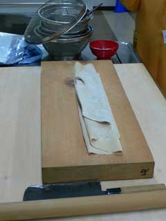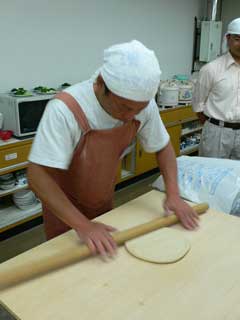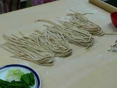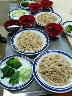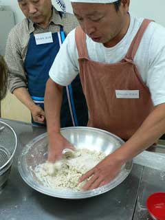 村山糧うどん武蔵村山市や東村山市、小平市などに伝わるうどんは一口に武蔵野うどんと呼んでいるが本来は丘陵地域で稲作に適さない土地のため小麦が栽培されていたのがそもそもの始まりのようだ。近年さすがに小麦農家は減ってしまったがまだまだ農業は身近に見ることができる。この農家の日常食がうどんであった。忙しい日常で手間をあまりかけずに食べるための知恵が詰まっている。日常食として存在する糧(かて)うどんに迫ってみる。今回武蔵村山市に発足した村山うどんの会のめんくいうどん教室に参加して村山糧うどんの作り方を3週にわたり体験した。農家の日常食としてのうどん東京西部エリアの丘陵地帯は水利の影響で稲作が適していないため麦の栽培が盛んであったという歴史がある。小麦は収穫すると製粉屋に持ち込んで小麦粉にして売ったり、乾麺に取り替えてもらったりとか日常の米の代わりとして主食の位置にあったようだ。忙しい農作業が終わってからの食事の支度は慌しいものであったに違いない。小麦粉と塩と水を混ぜ合わせて作るうどんに畑で採れた季節の野菜を付け合せる食事が主食であったのだろう。日常的にうどん食べられたことは容易に想像することができる。手間をかけない調理法が確立されてそれが伝承されたと言えるだろう。手間をかけないうどんの作り方全国各地にいろいろなうどんが有る。それそれの作り方にはその地方特有の方法がある。ある幅でその特長を備えることで讃岐うどんと言ったり、水沢うどんと言ったり、稲庭うどんと言ったりする。しかしそのエリアのうどんの作り方がすべてその方法かと言うとそれも異なる。極論すれば各店で異なったり、各家庭で異なることもある。その意味では武蔵野うどんと呼ばれる東京西部から埼玉県に広がるエリアのうどんの作り方も一つの型にはまらないおおらかさを持っているといえる。昔の家庭ならどの家にもあるような簡単な道具で作ることが可能なことも一つの特徴といえるだろう。村山糧うどんの作り方にその特徴をみてみよう。資料提供 村山うどんの会 めんくいうどん教室うどんの材料(準備するもの) ■うどん粉 1kg■塩 0から50g■水 400ccから500CC小麦粉と塩水を合わせる定義で言えば堅苦しいがうどん粉を用意するというのがまずは肝要。いわゆる中力粉をさすがここでは地元産の農林61号の小麦粉を指すと考える。塩の量に注目。0gから50gという数値は・・・作り方の幅の広さをあらわす。塩を入れないという選択肢もあるのだ。極端な例では塩水にしないで小麦に塩を振りかけて水入れてこねていくという手法も有る。今回のうどん教室では500グラムの小麦粉に対して5グラムの塩を用いた。水の量は塩を含めて210グラムを使用した。その日の天気や小麦粉の状態で数値が変るのは言うまでも無いがそれでも塩は低めである。もちろん1キロに対して50グラムを加える作り方もあるのでこうでなければいけないという絶対的なものではない。しかし塩の量が増えるとは茹で時間が長くなるという。早く食べるためには塩は低めなのかもしれない。今回の場合を数値化すれば小麦粉500g塩5g水205gであるが・・・計量カップで210ccを作ったのが実際である。もちろん粉の状態を見ながら加水するのは当然なので塩水は一度には加水しない。数回に分けて様子を見ながら行う。おおらかなのは塩水でも真水でも極端に細かなところは気にせずにその具合を重視することだ。塩分量が多ければ水と塩水の比重の差も大きくなるので水分量としてうどんの出来に影響を与えないこともないが、ここでは塩が少ないので大きな差にはなりにくい。■踏み一塊にした生地を袋に入れて踏む水とあわせた小麦粉は一塊にしてからビニール袋に入れて踏む。ビニール袋は10キロの米袋が推奨。ここでも特別なビニールシートを用意しない日常性がみてとれる。もちろんビニールシートでも良いと思う。踏んで艶が出るまでなじませる伸びたら丸めて数回踏む。(3から4回)裏返しても踏むのが私には珍しく感じられた。讃岐うどんのようにトコトン鍛えるという感じよりも艶が出たら終了と思ってよい。踏んでから仕上げた団子を寝かす玉にして30分程度寝かす。寝かし時間もいろいろな考え方がありそうだが、早く食べるというテーマの村山うどんだから30分はぎりぎりの選択かもしれない。長く寝かす場合は加水と塩の量を再検討する必要がでるだろう。特に新鮮な製粉したての地粉の場合粉に含まれる水分が多いような気がする。その日が雨だと加水量も慎重に決めたい。■のしと切り寝かした生地を大きく伸ばす麺棒を使ってのして行く。教室では円形に仕上げたり、四角に仕上げたりとこのあたりは個人の好みかも。この時点でもうお湯が沸いているという環境を整えておく。500gだと50センチ四方くらいに打ち粉をして10センチ幅の屏風だたみにして包丁で切る。厚さは3ミリから4ミリ。茹で時間を早めるために平打ちに近い麺線に