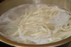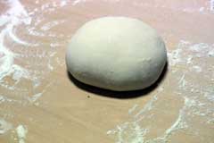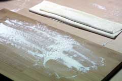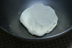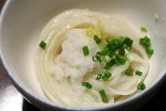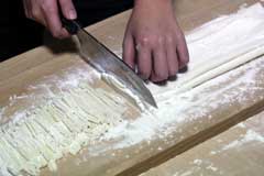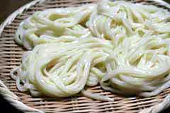 でき上がりのうどん今年も押し迫ってきました。大晦日は年越し蕎麦を食べて新年を迎える方が多いと思います。年越し蕎麦の起源やいわれは色々有りますが主なものは縁起かつぎ、運を迎える。または蕎麦の切れやすいところから悪縁を切る意味なども含まれています。一般には細く長く長寿を願うという意味合いの場合が多いようです。年越しうどん年越し蕎麦は全国的に食べられていますがうどんで有名なエリアでは当然うどんで年を越します。年越しうどんです。讃岐や武蔵野でもこの風習はあります。もちろん蕎麦を食べることも多いですが・・・年越しうどんは勝手に解釈すると細く長くよりも太く長くという縁起を担ぎます。人生太く行きましょう。暮れの忙しいひと時簡単なうどん打ちにチャレンジして今年は自家製手打うどんで新年を迎えてみましょう。年越し手打うどんレシピ 家庭にある道具で簡単にできる少人数分のうどんを打ちます。今回は比較的簡単に手に入る市販の中力粉を使って打ってみましょう。日清製粉の手打うどんの小麦粉は使いやすい打ちやすい小麦粉です。できあがりは白くつややかで少し固めのしっかりしたコシのある食感になることが多いようです。材料はシンプル材料 3人前●小麦粉 中力粉(日清製粉 手打うどんの小麦粉) 300g 1Kg 250円前後●塩 15g●水 135g (注意:例にした中力粉の指定レシピでは水は145gですが生地が少し柔らかくなります。)●打ち粉 コーンスターチ 適量道具道具も凝らなくて大丈夫ボール麺棒包丁打ち台用シナベニヤ板 90cm*90cm 省略可ビニール袋 計量ハカリ手順【塩水作り】塩水を作ります。15gの塩に135gの水を加えてよく混ぜておきます。塩が完全に溶けるようにします。【水回し】計量はしっかりとグラムでポールに300gの小麦粉を入れて軽くかき混ぜてダマがあればつぶしておきます。丁寧にするときは篩を使うとよりベストです。塩水を小麦粉に加えて混ぜ合わせます。始めはこねずに水が良くなじむようにばらばらにするようにかき回します。【捏ね】手だけで十分捏ねられます全体になじんだら捏ねます。手のひらで押すようにして伸びたら畳むを繰り返します。少量ですから手の力だけでも生地はできると思いますが丈夫なビニールシートに挟んで足で踏むと数回踏むだけで全体がしっとりします。【寝かし】通称だんごの出来上がった状態少し艶が出たらお供え餅のような形にしてビニール袋に入れて1時間ほど寝かします。寝かしている間にグルテンが成長してうどんの腰が出来上がります。【のし】まずは小判型全体に艶が出てきれいな表面になったら打ち粉を打ち台にまいてその上に生地を置いて上に打ち粉をまきます。手を使って生地をつぶして大きな円を作ります。向きを90度変えて麺棒をあてて楕円を作ります。生地の向きを変えて同じことをすると生地が四角くなります。全体の生地の厚さを整えて35センチから40センチほどの四角を作ります。生地の厚さがうどんの太さの一辺になります。無理に四角にしなくても可【切り】まな板にも打ち粉を生地の裏と表に打ち粉を振ります。屏風畳にして包丁で切ります。切り幅は割り箸くらいを目指すと良いでしょう。ゆっくり確実に4mmから5mmくらいでしょう。切ったら一度ほぐしておきます。密閉容器で保存150gを一人前として乾燥しないように容器にしまいます。【茹でる】最低麺100gに1Lのお湯で3人前を一度にゆでるときは5リットルくらいのお湯を沸かします。沸騰したお湯に軽くほぐしたうどんを入れます。軽くかき回します。再沸騰してきたら吹きこぼれないように注意して火加減を調整します。できあがったうどんの太さにもよりますが、茹で時間は再沸騰してから10分から13分程度でしょう。途中で1本抜いて水で洗って試食してみると良いでしょう。【洗う】流水で良く洗います。少し冷たいですが冷水で洗ってください。表面のぬめりが取れるようにもみ洗いします。うどんは切れませんが丁寧に洗いましょう。切り口が立ったエッジの効いたうどんが出来上がります。ピカピカのうどんざるに上げて水を切ります。できあがりをできるだけ早く食べましょう。盛り付け例生醤油うどんシンプルに食べるなら大根おろしに生姜とダシ醤油の生醤油うどん。冷たいうどんが一番コシやうどんの味がわかりますが、釜揚げやかけうどんも美味しいです。たくさん食べるなら関連リンクの上級編も参考になると思います。ご注意使用する小麦粉の種類や部屋の温度などで加水量が変わることが有ります。粉の量の45%から50%程度の幅があります。関連記事手打うどんの作り方手打うどんの保存法プロ用小麦粉を取り寄せる田澤麻衣の シコシコ!手作り讃岐うどんに挑戦 おいしいうどんレシピ集※記事内容は執筆時点のものです。最新の内容をご確認ください。※メニューや料金などのデータは、取材時または記事公開時点での内容です。