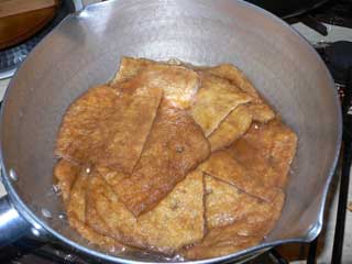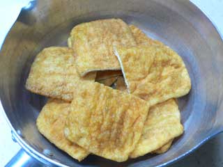 手順湯抜きの準備油揚げを好みの大きさに切ります。半分の四角、それを三角に切っても良ですが、今回は半分に切りました。長いまま豪快に1枚のままでも良いとおもいます。今回は贅沢に一人一枚分の二枚です。油揚げの下処理湯抜き簡単に済ませるならざるに油揚げを置いて熱湯をかけて油抜きをするだけでもよいですが、油揚げに味を良くしみこませたい場合は下処理として、たっぷりのお湯の鍋で10分ほどゆがきます。ざるに取り水気を切り冷ましておきます。味付け鍋に鰹だし(お湯+粉末鰹だしでも可)をはり、沸騰したら油揚げを入れます。味付けの順番は砂糖を入れて暫くして煮詰まったら淡口醤油を入れます。落し蓋をして煮汁が半分程度なるまで中火で煮ます。仕上に味醂を入れても良いですが油揚げが少し硬くなります。煮上がり前のページへ123次のページへ