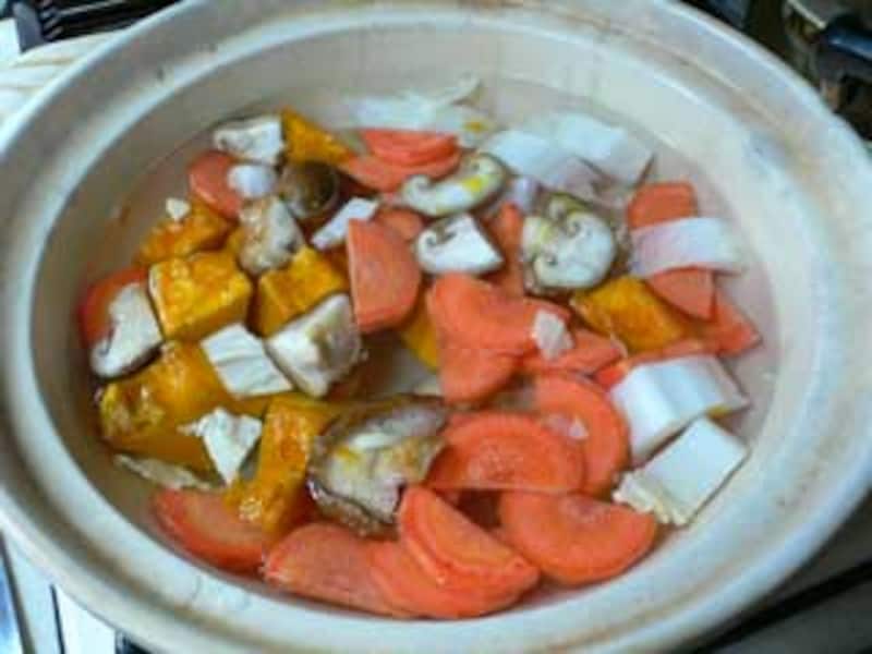 ジャガイモ・ニンジンなど少し固い野菜から煮込むとよいでしょう。