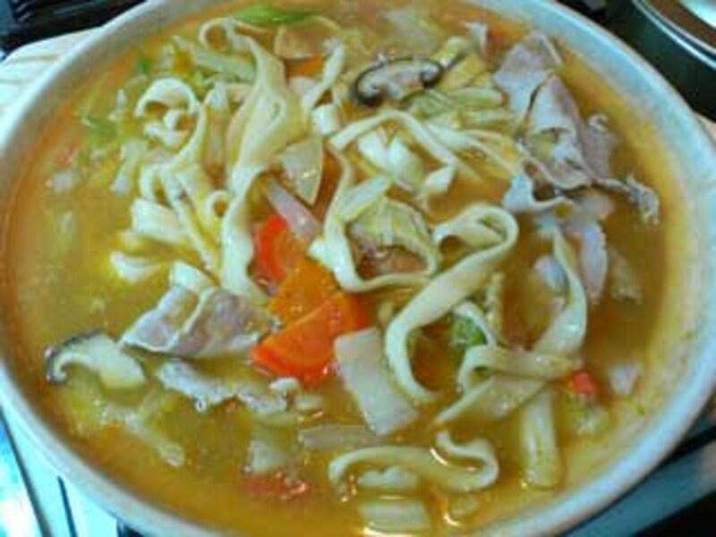 ほうとうがしんなりして膨らみます。たっぷりと野菜のスープを吸い込んで柔らかくなったような、まだ固いような独特の食感です。