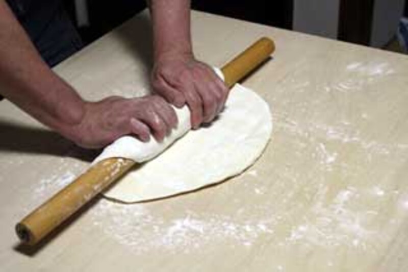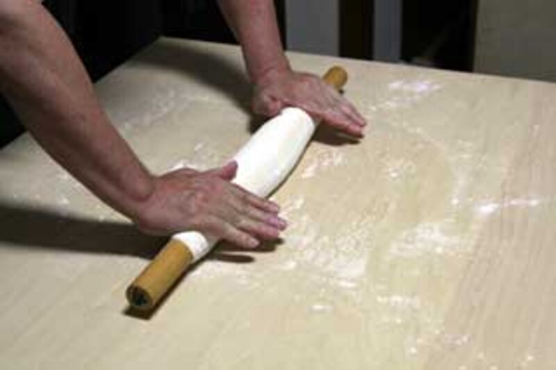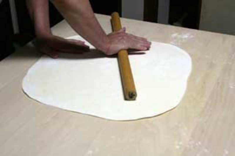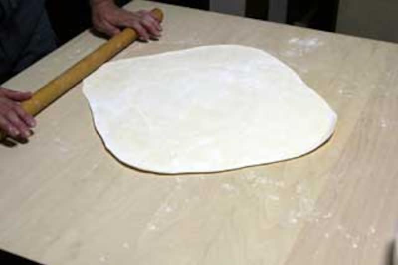 麺棒を使って体重をかけてまた大きくします。前後が済んだら生地を90度回転させてまた前後に大きくします。