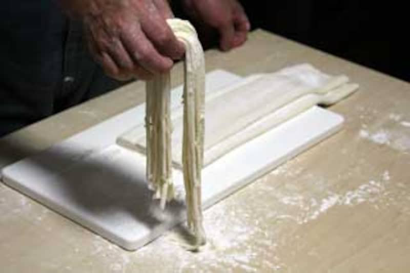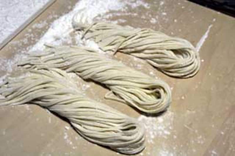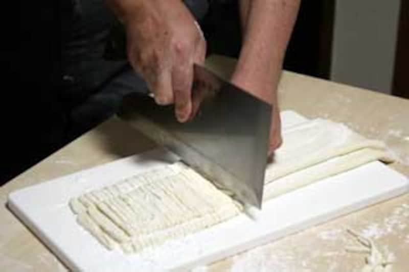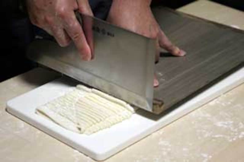 生地から麺線を切り出します。お好みの太さで切ってよいのですが目安としては4ミリから5ミリ程度です。生地の厚さが約4mm程度です。4mmで切ると四角のうどん。5mmで切れば少し平べったいうどんになります。生地をもっと薄く仕上げて幅広で切ればきしめんにもなります。