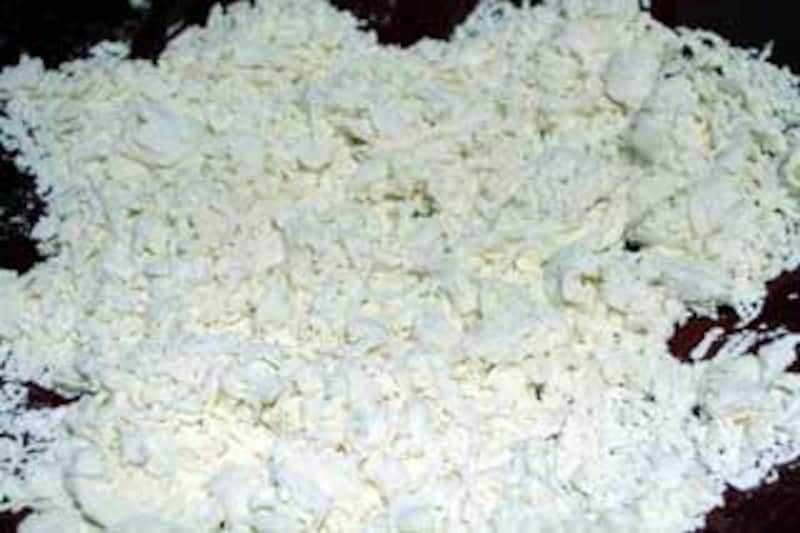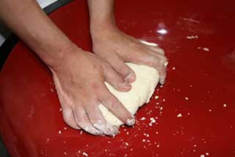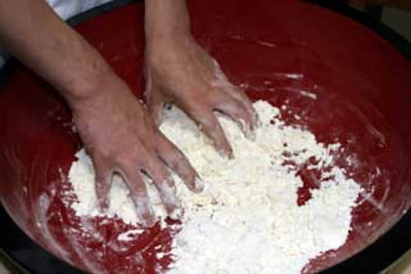 あわせ(水回し) 写真をクリックすると次の手順に進みます 手早く撹拌します。捏ねないように 塩水を入れたら両手の指を立てて撹拌します。下から粉を上に跳ね上げる感じで水が粉に万遍なく行き渡るようにします。 塊や粉の部分に分かれてきます 鉢の周辺の粉も中に集めていきます。粉と水を混ぜると言う感じでここではまだ捏ねてはいけません。 予備熟成の準備 粉が水分を吸うとひらひらとしたそぼろ状の小さな塊になってきます。この状態で水回しは終わりです。 握れる程度の塊にする 予備熟成は踏みの前に粉を休ませることで水が行き渡り安定した状態になります。ばらばらの生地を移動できる程度の固まりにします。 次の手順は、「予備熟成」です >> 前のページへ1…678…17次のページへ