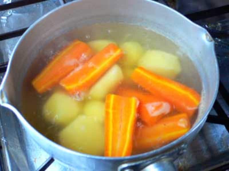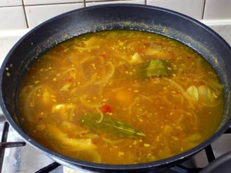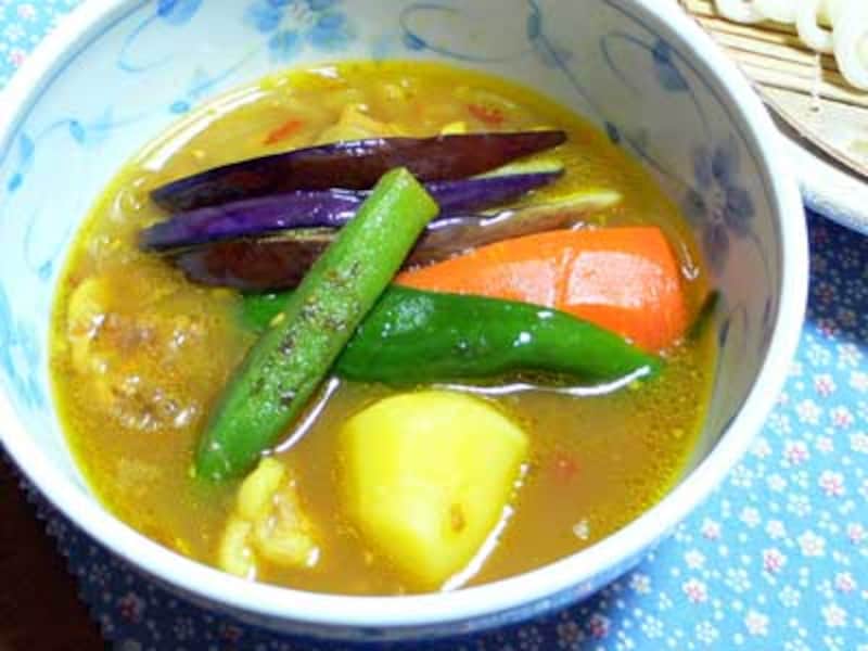 下準備Aの手順タマネギ炒めはカレーの基本タマネギの薄切りを中火で炒めて甘みを出す。バター全量かサラダオイルと併用かどちらでも良い。茶色になるまで炒めるとコクが出るが今回は透明度が増したあたりで止めた。スープの仕込みBの準備定番香辛料は欠かせないニンニクはみじん切り、タカノツメはタネを出してみじん切り。ショウガも薄くスライスしてみじん切り。バターとサラダオイルで炒める。鶏肉は半身を皮付きのまま4つに切り分ける。一人前として4片を使う。皮がある方がジューシーに仕上がる塩胡椒をしたものを皮目のほうから焼く。少し焦げ目が着くと良い火が通ったらAとあわせて水を加えて沸かす。沸騰してきたら灰汁を取り除く。油分も浮いてくるので軽く取り除く。ブイヨン4個とコンソメ1個を加えて煮込む。スープの一部でカレー粉を溶いて鍋に戻す。カレー粉は小麦粉と合わせないでそのまま入れる。とろみがつかないさらさらとしたカレースープになる。塩で味を調整する。飲める程度の塩味で固定しておく。目安は塩2つまみ程度。カレー粉でなく市販のルウを使う場合は4皿分の分量を使用する。塩はカレー粉の場合と同量程度は必要。具材とトッピングの準備Cの素材 コンソメスープで煮込んだ野菜煮崩れしやすいニンジンとジャガイモはスープとは別に仕込み最後にあわせて煮込む。ニンジンは縦長の四分割。面取りしておく。ジャガイモは皮をむき大きめにカットしておく。スープの中でゴロゴロ感演出したい。Dの素材茄子やピーマンは煮込むと色がきれいに出ないので軽く炒める程度で発色を止める。軽く塩胡椒しておくのも良い。茄子と油は相性が良く油を含んだ茄子は美味しい。オクラは洗ったら塩を振って軽くまな板の上で転がして表面の毛を落としておく。半分に縦割りして軽く炒める。ここでの野菜は比較的大きめに切るのが良いだろう。カレースープを完成させる煮込み中のスープ煮込んだスープはそのままでもかなり美味しく感じると思うが、仕上にガラムマサラを加えると辛さと香りが立つ。一人前ずつ小鍋にスープを入れて味を調える、塩、醤油、インスタントコーヒー、ココナッツミルクパウダーやカレー粉の増量なども可能。自分の好みの辛さや好きな香りに目覚めるかも。なおカレー粉(SB赤缶)は入れすぎると苦味が出ることがあるので注意。色々なカレー粉やスパイスを試してみると良いと思う。できあがったスープカレー味が調ったら熱いまま盛り付ける。スープ皿に入れて炒めた野菜類を上に載せる。うどんなので今回はどんぶり。茹でて締めたうどんを盛り付けてカレースープと一緒に提供する。うどんは熱くした熱盛(あつもり)や釜揚げも良い。ピリッとした本格的な辛さのカレースープ。うどんのお替りも有るかも。うどんが無い場合は当然ご飯も美味しい。食べ過ぎ注意。バリエーション鶏肉の代わりに豚肉や牛肉でも美味しいのでお試しを。肉団子、ハンバーグも当然美味いのでご活用ください。カレーうどん関連記事カレーうどんの作り方 冷熱(ひやあつ)カレーうどんお手軽カレーうどんができるカレー釜七残ったカレーで作る、エコ・カレーうどん 料理のABC カレー南蛮うどんが美味しいお店 彩め 前のページへ12※記事内容は執筆時点のものです。最新の内容をご確認ください。※メニューや料金などのデータは、取材時または記事公開時点での内容です。