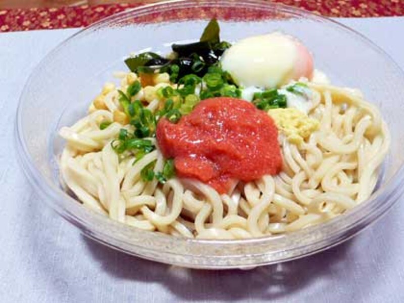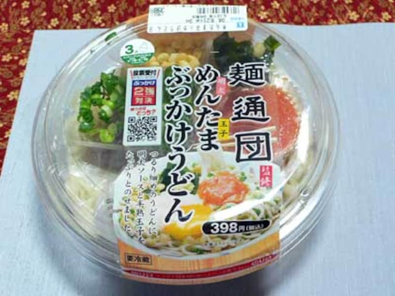 さあどっち派?たくさんのご支援ありがとうございました。おかげさまで好評で販売期間を終えることがてきました。LAWSON ぶっかけうどん対決 いよいよ始まりましたうどん対決。うどん研究家 蓮見 壽 対 麺通団の監修うどん対決。期間限定 8月19日から9月15日 全国のLAWSONで発売本番商品を購入してさっそく食べてみました。美味しく食べるコツなどお知らせいたします。麺通団 めんたまぶっかけうどんめんたまぶっかけうどん 398円細麺に明太子ソースと温泉玉子が載る豪華版です。天かす、青ネギ、ショウガ、ワカメが載ります。めんたまの内容たっぷりの汁でうどんをほぐします。細い麺なので少し癒着が有りますが多少時間をかけてゆっくりとほぐすと無理なくほぐれますから焦らずにどうぞ。明太子ソースと温泉玉子をおとしたら良く混ぜて食べます。盛り付け例(蓮見)色彩的には明太子の赤と温泉玉子の黄身が混ざりますので微妙な色になりますが心配ご無用。ビリ辛の明太子と玉子が溶け合い冷たいバスタ感覚で食べられます。かなり美味しいです。次のページで蓮見のすだちとおろしのぶっかけうどんを解説12次のページへ