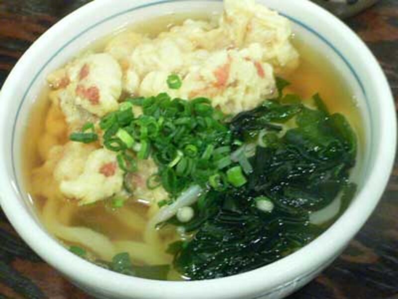 温かいうどんに揚げたてのかしわ天。地味あふれるだしの風味がたまりません。鳴門わかめも旨い。