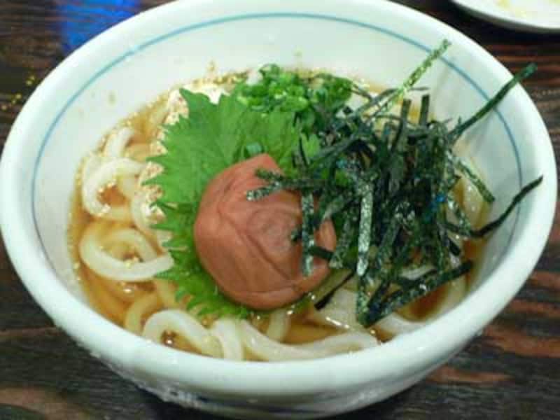 驚くほどの大きな梅干が載るうどん。