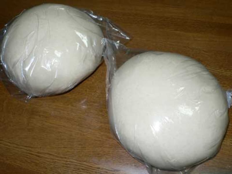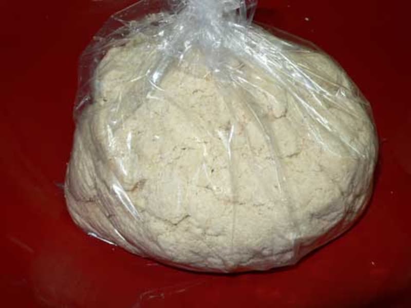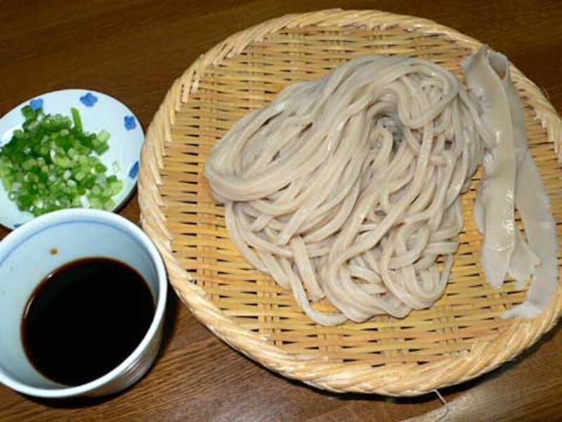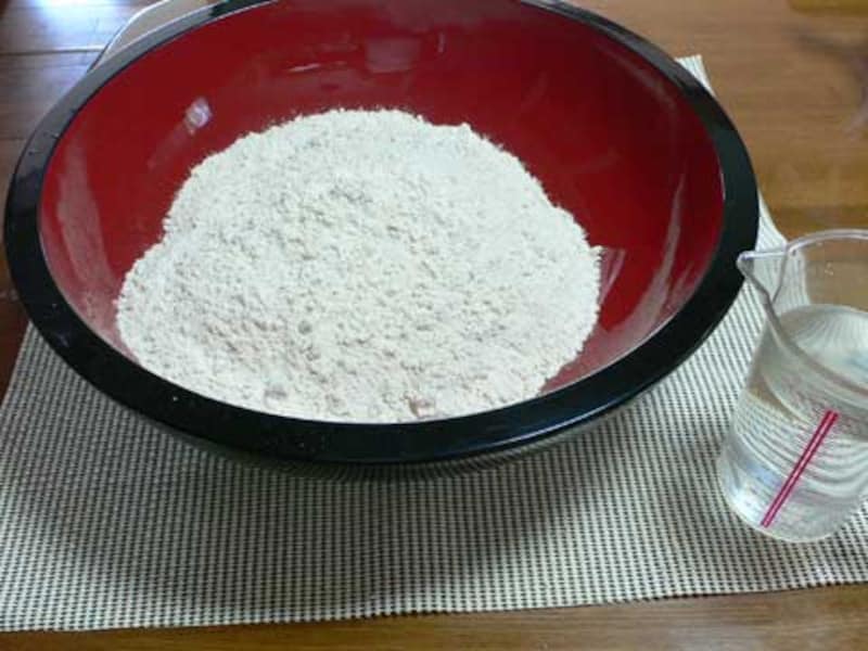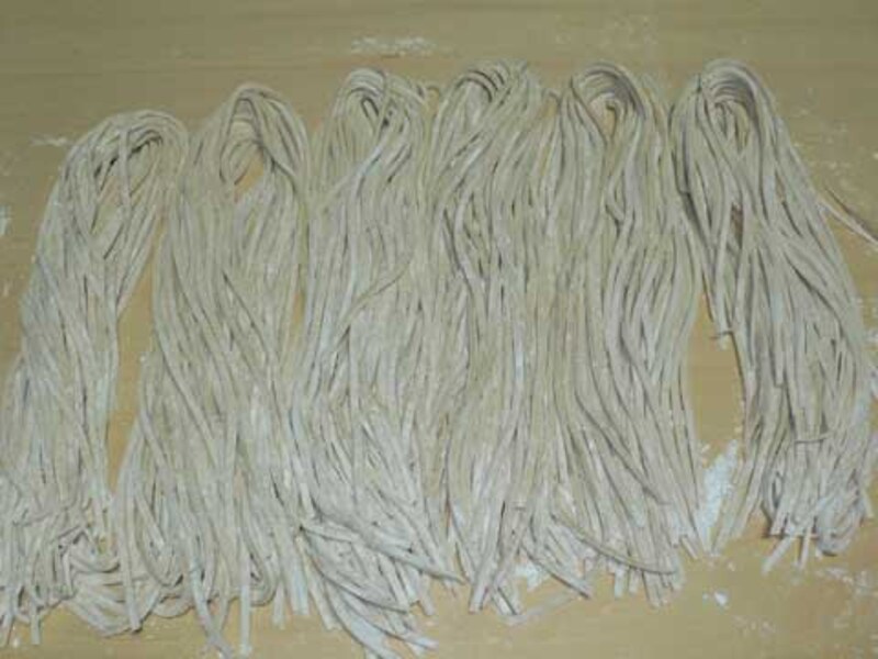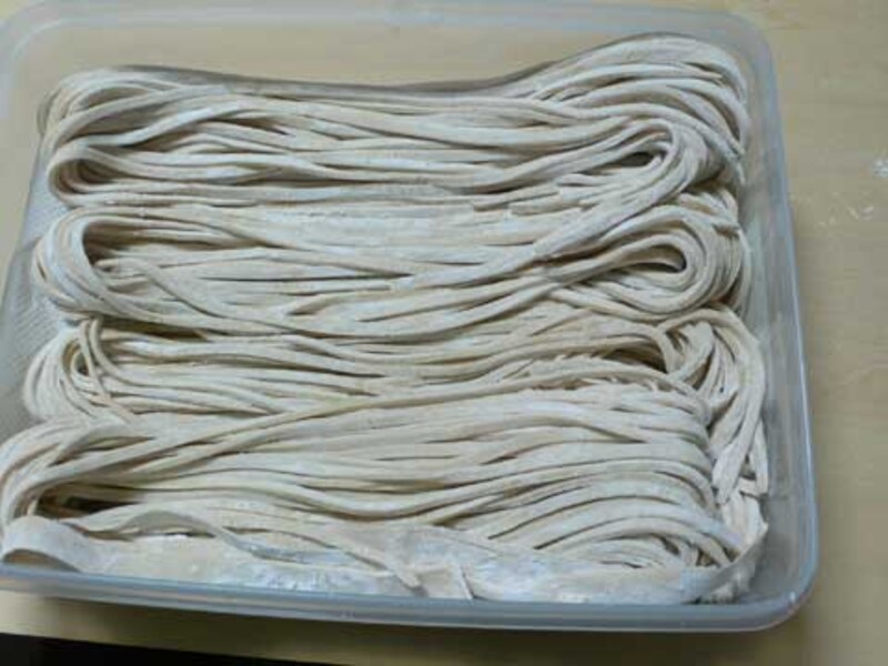 曽我製粉 農林61号石臼挽き 5kg 入り農林61号100%のもりうどん2009年6月末で群馬県の製粉会社曽我製粉株式会社が操業を停止する。群馬県産小麦の製粉や新品種の小麦の製粉に力を注いでいた会社で非常に残念だ。曽我製粉 農林61号石臼挽き 100%を打つ手間のかかる石臼挽きは小麦粉では珍しい。一般的にはロール製粉で効率よく良質の小麦粉を生産するのが最近のハイテク製粉会社なのだが石臼挽きのメリットはどのへんに有るのだろうか。【材料】画像は2kgの小麦粉を使用した例です。曽我製粉 農林61号石臼挽き 2kg 加水量 900g 塩(120g)水回し鉢の作業 小麦粉は多少色が褐色かかっているが粉の状態ではそれほど黒いとは思えない。鉢作業前の状態加水するといっきに色が変わって褐色が強くなる。粉の香りが立つというか小麦の香りが強く出る。ASWに比べて多少加水を控えている。塩の量も考えると水の比率はかなり低く、水まわしの時には少し固めかなという感じで作業を終える。予備熟成をすることで踏みの工程が楽になる踏み踏みの注意点は踏みすぎて生地を締めすぎないこと予備熟成を1時間ほどしてから踏む。踏みの回数は生地の表面が滑らかになる程度。踏んで畳んで生地を成形する。行程はASWの打ち方とほぼ同じ。踏みの回数が多少少ないか。踏みすぎるとできあがったうどんが締まりすぎる。生地を半分にして2個の団子にする。寝かし生地を休ませてから団子を作る。団子で3時間ほど寝かせる。団子延し踏んで座布団にしてからのす。のしの方法も特別なことは無く丸出しして角出しして大きくする。一般的にはASWよりもグルテンの生育が弱いとされているので気持ち力を弱めて丁寧に生地を扱う。地延し角だしのはじめ小判型を作り90度移動して延ばすとほぼ四角の生地が出来上がる。延ばしたいところを気持ち強く押すことでそこの部分が伸びて行く。延し最終全体をむらの無いように平らに延す。空気が入っていたら楊枝などで突いて空気を抜いておく。切り生地の裏と表に打ち粉(コーンスターチ推奨)を多めにあてて屏風畳みにしてきる。切りは麺切台にて4mmに切り落す。きっちりとした切り口が印象的である。家庭の場合は手駒でも良いのでゆっくりとしたペースで4mmから5mm幅を目指して切り落す。きった後は1食分150g程度に取り分けて麺線をばらばらにして折り皺を延ばしておくと良い。切り終えたうどんはさばいておく切りおえたうどんは密閉容器に保存。できる限り翌日までには食べきろう。保存する場合は小分けして冷凍保存が良い。できあがったうどんでは次は美味しい食べ方へ12次のページへ
