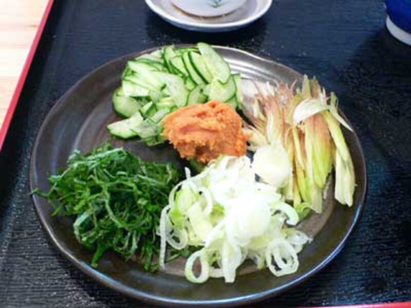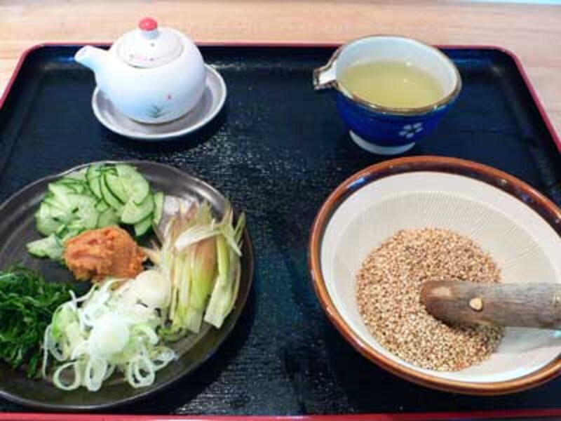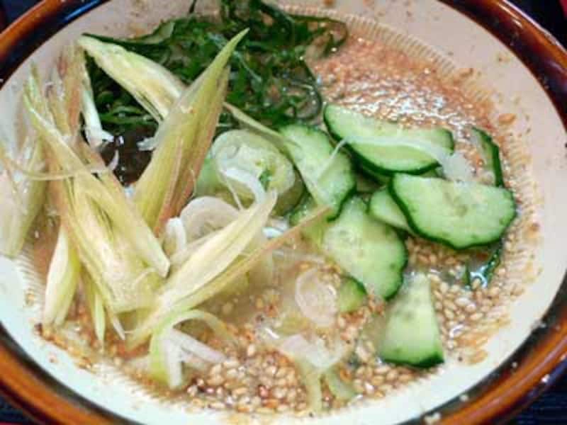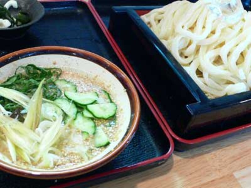 手打ちうどん さわいちさいたま市見沼区の手打うどん さわいち。昨年五月に店舗移転をしたがその後も引続き人気店である。2009年夏に訪れたら夏季限定で『冷汁うどん』900円がメニューにあった。冷汁は埼玉ではなじみのあるうどんの食べ方である。私の住むさいたま市や県北部などでは夏のうどん用つけ汁として人気がある。加須(かぞ)のうどん店子亀では看板メニューとなっている。その加須の子亀にも勝るとも劣らない『冷汁うどん』にさわいちは仕上ていて驚いたので報告したい。冷汁とはごまと味噌をベースに紫蘇、キュウリ、ミョウガなどの薬味をあわせて冷たい出汁で割ってのばしてうどん用のつけ汁とする。甘みが入る場合と入らない場合がある。これは郷土食的な家庭料理の範疇に入るので各家庭の味として受け継がれているようだ。よってさわいちでは甘みの調整ができるように甘味は別こしらえで調整できるようになっている。ちなみに宮崎名物の冷汁とは違う食べ物である。【手順】まず冷汁うどんを注文すると材料のセットが運ばれて来る。擂鉢に入ったごま。薬味類と味噌。冷たい出汁(だし)、甘味(砂糖液)がその内容。自分で作る冷汁セットはじめにごまを擂る。うどんが茹で上がるまでに自分でごまを擂って待っている。あたり鉢にたっぷりのごまが入って供されるのでひたすら擂る。冷汁の材料 ミョウガは無いこともあるごまが擂り終わったら味噌を入れてあわせる。この時キュウリや紫蘇を一緒にすりつぶすと緑かがったごま味噌が出来上がる。私は紫蘇やキュウリ、ミョウガ(好みがあるので入らないこともある)は擂らずに形のまま投入するほうが好きだ。冷たい出汁と甘味を注いで冷汁を仕上る。ごまを擂り味噌と出汁を合わせる日清製粉の白椿で打たれたうどんは艶やかでコシも弾力も申し分ない。茹で立てを冷たく締めて氷と共に出で来る。まさに水も滴る状態で出てくる。この氷を汁に数個放り込んでおくとより冷たい汁に仕上がる。茹で立てヒヤヒヤピカピカうどん冷たいものは冷たく、熱いものは熱いうちに食べるのが私の方針なので、より冷たくした冷汁でささっと食べる。時間を置くと氷が解けて汁が薄まる。手打ちの太目のうどんはプリプリのもちもち。噛み締めてもよし喉越しもよし。一度にたくさん啜りこむと口の中は大変なことになる。うどんが長い。数本つまんで啜るべきだ。口の中に香ばしいごまの香りと紫蘇やミョウガの香りのハーモニーが広がる。これが絶妙。できあがりの冷汁キュウリのシャキシャキ感も気持ちが良い。体の中から爽やかになるような絶品の冷汁うどんである。自分の好みにより薬味の擂り具合や甘みの調整などできるのが嬉しい。はじめは甘味を入れずに食べ進んでから少しずつ入れて味の変化を楽しむのも良いかと思う。冷汁とうどんが並ぶ2009年夏に食べた絶妙の一杯であった。2009年は8月31日で冷汁は終了したそうです。【手打うどん さわいち】埼玉県さいたま市見沼区大和田町2-1009-1048-688-3888営業時間11時から午後15時月曜定休 (祭日の場合は営業)関連リンクガイドのさわいち紹介記事ガイドレシピ 冷汁うどんの作り方 ※記事内容は執筆時点のものです。最新の内容をご確認ください。※メニューや料金などのデータは、取材時または記事公開時点での内容です。