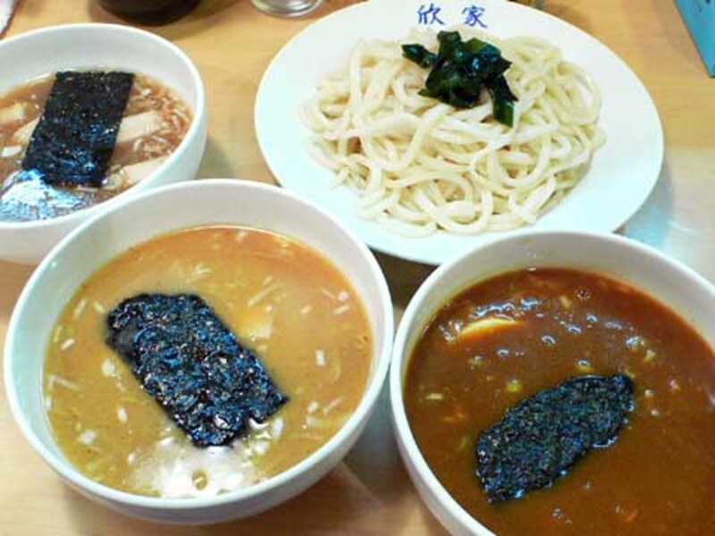 手打ちつけ麺 欣家つけ麺といえば・・・つけ麺と言えば今やラーメン店の人気メニュー。つけ麺専門店というジャンルも確立しそうな勢いです。うどんの側から見るとまさにうどんの食べ方なのですが・・・冷たいうどんを汁につけて食べれば、これすなわち『つけ麺』なのですが。(笑)関東でよく食べられる『肉汁うどん』や『糧うどん』はかなり昔からある食べ方です。温かい汁に冷たいうどん(麺)の組合せ。また温かいうどん(麺)の組合せも有ります。一般的に冷たい汁につけるものを『もり』とか『ざる』と呼ぶことが多いようです。ラーメン界のつけ麺で有名なのが東池袋大勝軒です。店主の山岸一雄氏が考案したものとして有名です。一度締めた冷たい麺を熱いスープにつけて食べると言うスタイルです。このつけ麺に力を入れているラーメン店つけ麺 欣家(板橋区高島平)の店主斉藤さんは2009年初頭から自家製麺の技術を活かしてうどんの研究をつづけて来ました。2009年9月からカレーつけ麺(中華麺)800円を発売開始。それに伴い研究を重ねてきたうどんもメニューに載せることが決定しました。つけ汁は左よりしょうゆ・味噌・カレー(試作)欣家のうどん自家製麺でつけ麺用の太麺とラーメン用の細麺を作っている欣家ですが、うどんを完成させるまでは色々試行錯誤があったようです。小麦粉の選定、配合、塩の量、加水率、麺としての切り出し。当初5月の連休後には開発が終わると予定されていたのですが、産みの苦しみというか、完成度を上げるための試行錯誤がかなり続いたようです。うどんは長野産の小麦粉をベースに配合され製麺されています。国内産小麦粉にこだわり、なおかつ食感の良さを目指して研究されたようです。茹で時間を短縮できるようにうどんとしては少し細めの中細の透明感のあるものが完成しました。表面は滑らかでツルツルと喉越しの良いコシの強いタイプのうどんに仕上がっています。うどん中盛350g中華麺を使ったつけ麺は欣家のトレードマークでファンがとても多く、盛の良い太麺を『めひかり』や鰹節系のダシの効いた汁で啜りこむお客さんが多いのですがこのうどんはどんな反響を呼ぶでしょうか。しょうゆつけうどん 630円しょうゆつけ汁 定番の美味しさ中華麺用の汁より出汁を濃い目に使って醤油返しも多そうです。より和に寄ったテイストですがベースはつけ麺用スープです。具は茹玉子とメンマ、海苔、角切りチャーシューです。魚系の香りが良くたちます。普通盛のうどんは250gの予定です。味噌つけうどん 680円味噌つけ汁楽しい食感が楽しめる味噌ベースのつけ汁はやはり濃い目の和テイスト。でも不思議なことに今まであまり経験したことの無いうどんの食べ方としてのインパクトが強いです。味噌の種類によるものなのかとん汁にうどんを入れたような錯覚。3種の中では一番印象に残りました。やはり肉系の出汁と魚系の出汁がミックスされた複雑なスープと味噌の融合なのかもしれません。カレーつけうどん 800円スープカレーうどんとも言えそうな・・・カレーつけ麺をまだ食べていないので中華麺との比較はしにくいのですが、カレースープは濃い目の少し重い感じで、しっかりとした味付けです。一番無難にうどんに合うことが想像できますがいわゆるカレーうどん的な味ではなく、つけ麺としての美味しさが追求されています。食べ終わったらご飯が欲しくなるのかなぁ・・・と思いますが。炭水化物の摂り過ぎになるかも。以上3種類のつけ汁うどんが提供されますが、ラーメンとの勢力分布はどのようになるでしょう。当面仕込み量は相当差があるので売り切れのことも有るかと思いますが、ラーメン店のうどんで挑戦、どんな結末になるか楽しみです。追加情報うどんは茹で時間がラーメンよりも長いのでご注文の時には時間の余裕をみてお願いします。発売開始予定 2009年9月15日火曜日より 一日限定20食(予定)ご注意 画像は試作のため3種のつけ汁が提供されています。正式メニューでは注文したつけ汁1つ提供されます。また具材の内容が異なる場合も考えられます。欣家 (きんや)住所: 東京都板橋区高島平1-62-6 TEL: 03-3934-3016営業時間: 11:00~14:30 17:00~22:00定休日 日曜日駐車場 無 道路沿い南側100m先にコインパーク有り最寄り駅 都営三田線 西台駅より徒歩7分程度※記事内容は執筆時点のものです。最新の内容をご確認ください。※メニューや料金などのデータは、取材時または記事公開時点での内容です。