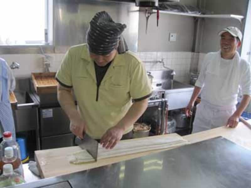 新生 宮武うどん 宮武うどん復活2010年3月、高松自動車道高松西IC近くに宮武うどんの文字が書かれた建物が登場。以前は別名の名前がついたうどん店だった。うどんマニアの間では「どこの宮武うどん」「あの宮武うどんが復活か?」などの多くの憶測が飛ぶ。そして4月その全容が発表された。2010年4月12日新店舗としてのオープンが告知がされた。宮武閉店後に弟子入りした元和食職人の谷本和正さんが宮武うどんの味を引き継ぐことになったという。詳細は不明だが宮武流完全手作りうどんを踏襲して新店舗を立ち上げた。さっそく高松に飛び、開店二日目4月13日、宮武の味を確かめてきた。醤油かけうどん小200円 新生宮武うどん開店時間10時には少し遅れたが10時30分に到着。駐車場は7割程度埋まっていた。店に入るとお盆と水を自分で取ってカウンターでうどんを注文。行列5人程度。カウンター内はうどん打場、切場(木製まな板) うどん盛り付けの順。後ろにうどん釜と玉取り場。この辺のレイアウトは琴平の宮武うどんと同じようなレイアウト。まずはあつあつ230円とひやひや230円を頼む。受け取ってから天ぷらコーナーにて天ぷらやおにぎりなどが取れる。天ぷらコーナーでげそ天100円を取る。天ぷらは自家製に変更。会計を済ましてテーブルに。あつあつうどん小 どんぶりは小ぶりだが盛りはかなりよい。ねじれとくぼみがある宮武のうどん、緑あひるの特徴のあるうどんが完全復活。澄んだダシもうまい。ひやひや小 違うのはげそ天が藤原屋からの仕入れ品ではなくなったこと。天ぷらは揚げたての自家製。自家製のげそ天はふわふわの柔らかな食感 げそ天は柔らかく、歯に不安がある私にはちょうど良かった。(笑)ふと製麺コーナーに目をやると元宮武うどんの大将宮武一郎さんが店頭に出てきていた。指導というか手伝いというかなんと!うどんも伸ばしている。うどんを打つ宮武一郎さんと新店主の谷本さん 手切りも・・・少し切ったところで新店主に交代していたが・・・たまらずにお代わりを注文に行く。こんどはしょうゆかけうどん200円。宮武さんと一言二言言葉を交わし笑顔の大将の姿を見ていると恥ずかしながら目頭が熱くなる。並んでいるお客さん。食べているお客さん皆嬉々としてお店のこの雰囲気を楽しんでいる。店主の手切の技を見守る宮武さん 宮武さんは大変元気そうで安心した。顔色もよく10ヶ月ぶりのうどん打ちとお客さんとのやりとりを楽しんでいるようだった。行列は11時過ぎ頃には店内から外まで伸びる。誰も文句も言わずに並んでいる。昼時の行列は当たり前・・・讃岐の風物詩復活である。暖簾も釜も包丁、お品書も以前使っていたものだとか。今月末からの大型連休には混むだろう。しかしやはり一度は立ち寄りたいと思うのが人情だろう。覚悟して並びたい。まだ連休中の営業日の案内はないようだが。2010年4月5月のGWの営業情報を入手できたので書いておきます。4/23(金)臨時休業 4/28(水)定休日 5/5(水)臨時営業 5/6(木)臨時休業 情報提供 さぬきうどん食べ、歩きの別府さん 2010/4/15手打 宮武うどん住所:香川県高松市円座町340番地 電話:087-886-0939定休日:水曜日営業時間:10:00~15:00売り切れ終了ありyahoo地図情報 宮武うどん付近※記事内容は執筆時点のものです。最新の内容をご確認ください。※メニューや料金などのデータは、取材時または記事公開時点での内容です。