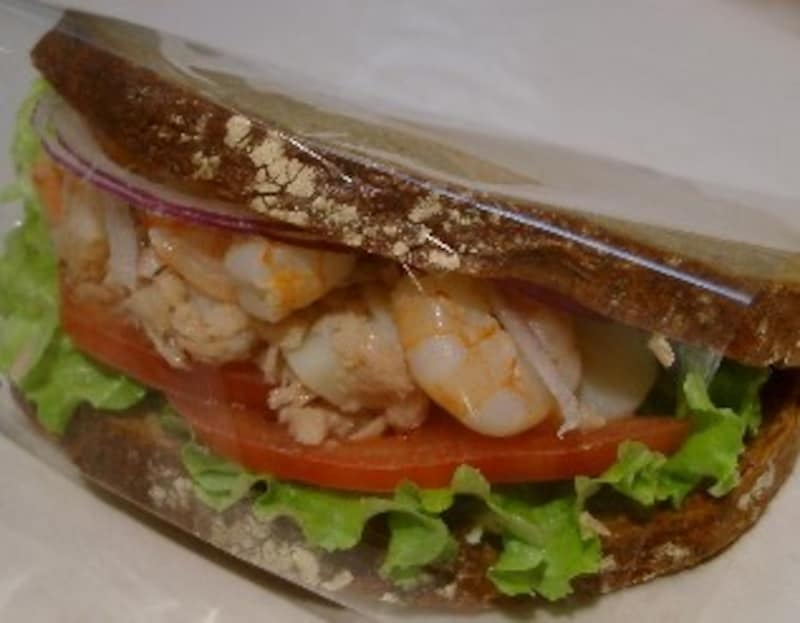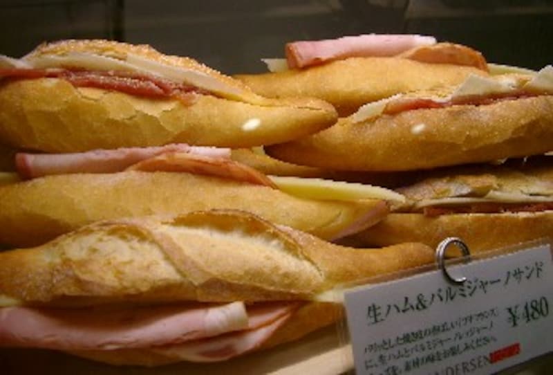 2002年12月1日にグランドオープンしたカレッタ汐留 は電通本社と劇場、食、ショッピング施設などの複合ビル。 この中にベーカリーチェーン、アンデルセンが新業態としてオープンさせた、パンとサンドウィッチのテイクアウト専門店、 アンデルセンファブリックがあります。 fabrik(ファブリック)はデンマーク語で工場 を意味します。これは「ビル館内のパン工場」をイメージしたもの。 対面式の売り場からは、清潔なガラス張りのパン工場(製造スペース)を見ることができます。 パンは近隣のオフィスワーカーのランチや残業の時の軽食、会議用にと利用され、 電通四季劇場の観客や、通りがかりに目を奪われて思わず買ってゆく人々にも人気のようです。 サンドウィッチに使うバゲットやライ麦入りのパンは店内で焼き上げ、それだけでも販売しています。 近隣のレストランやカフェからバゲットを調達しに来る店員さんの姿も見かけました。 でも、こうしたハード系のパンは発酵に時間がかかるため、現在は大量には受けられる体制ではないということでした。 380円からのサンドイッチは、全16種類。この店限定のオリジナルです。 オーダーメイドではありませんが、時間帯に合わせて少しずつ作り、 フレッシュな商品を置くことに重点を置いているそうです。 人気のダークチェリーデニッシュなど、他店と同じ商品もありますが、 フォカッチャやピザ、マフィンなどはここだけのものです。 シーザースサラダや抽出したてのコーヒーなども販売しています。 サンドウィッチの中でも一番人気なのは、アンデルセンらしくシュリンプを使ったもの。 ツナサラダ&シュリンプサンドは、ほのかな酸味を持つミッシュブロートに、じゃが芋の入ったニース風ツナサラダとシュリンプ。(上の写真) シュリンプエッグは、ごまの入ったトレコンブロートに卵サラダ、白ワインでソテーしたシュリンプ。 そのほかにも魅力的なサンドウィッチやスウィーツがたくさん・・・ 12次のページへ