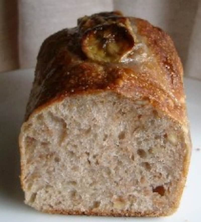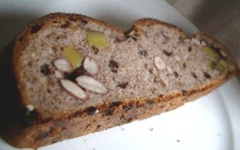 窯の燃料の薪は4時間焚いて、おき(炭)にして1時間寝かし、掃除してから使われます。すぐ焦げるのでタイミングを見計らうのが大変です。温度計も置いてありましたが やはりそこは気候とも相談しなくてはならないようです。 窯焼きされたパンはクラストが厚めにこんがり焼け、こうばしくなります。 それではパンをご紹介しましょう。 胚芽と全粒粉のパン、ふすまとレーズンのパン(左の写真 各400円)は繊維とミネラル豊富な食事パン。 ふすまは近所の農家で作られる小麦の皮の部分です。 そしてゼルコバならではのカンパーニュ(下の写真)。なまこ型の大きなパンで、 ライ麦15~20%の生地に甘くない金時豆、あずき、胡桃、カランツ、さつまいもなど いろいろなものがモザイクのように入ったパンです。これはグラムで1.4円。 ![]() カンパーニュ 人気のあるバナナのパン(下の写真 300円)は、胡桃入りで蒸したようなもっちりした食感。りんごのパン(100円)もチップ(軽く焼くこと)して果実の自然の甘味を引き出しています。 ![]() バナナのパン 自家産のじゃがいもとツナ、大葉入りのツナポテトのパン(100円)はお昼に嬉しいお惣菜パン。 ふかしたかぼちゃとさつまいもをミキシングしたパン(80円)なんていうのもあります。 金時豆あんぱん(下の写真 100円)はお焼きのような粒餡と金時豆のパン。 他にも果物のパイやはちみつ黒ごまクリームのパン、舞茸のパンなど、素朴なパンがいろいろ並びます。 細長い形がユニークなスコーンはプレーン(200円)とチョコ(250円)があります。
