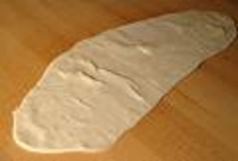 麺棒で厚さ1~2ミリに伸ばす。丸いのを3枚、あるいは写真のように長い楕円を6枚など、自分のオーブンに都合の良い形にして、生地のできあがり。