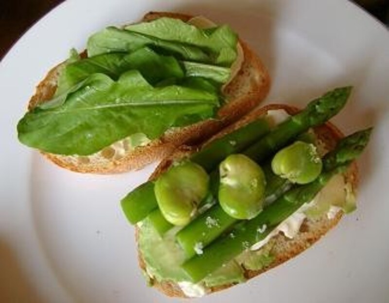 鮮やかな緑の野菜で素材の味を楽しむサンドウィッチを作りました。ホクホクしていて少しほろ苦いそら豆、ごまの香りのルッコラ、アスパラガス。バターやマヨネーズは使わず、アボカドでまろやかにまとめます。
