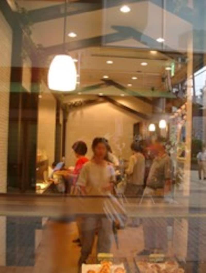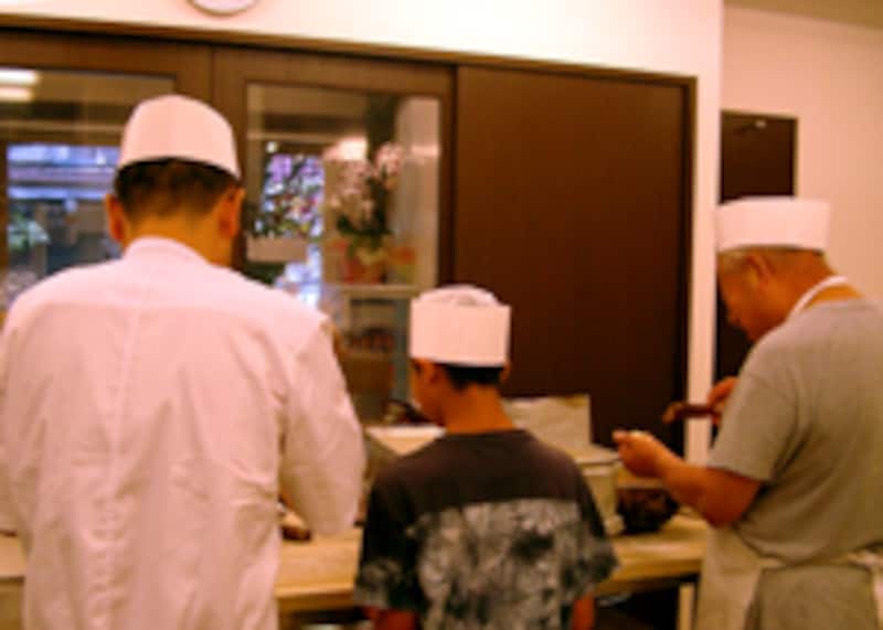 | 売り場と厨房は素通しの窓で双方から様子が見える。 先代とご主人の間でパン作りを見る少年は未来の4代目かも? |