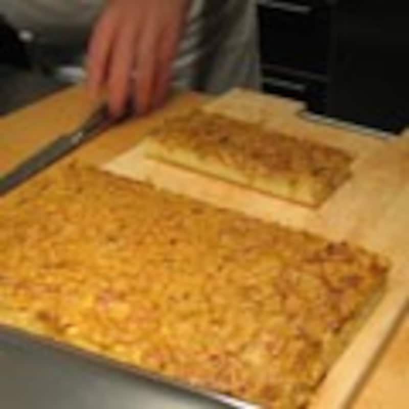 ツヴィーベルクーヘンは玉ねぎのケーキ。でも砂糖が入っているわけではありません。ベーコンとニンニクで飴色に炒めた玉ねぎを、キャラウェイやマスタードで風味づけしたサワークリームと卵のソースと共にパン生地にのせて、天板いっぱいに焼くというものです。砂糖はなくとも玉ねぎの甘味の効いたパンです。これはノイワイン(ニューワイン)と共に9月頃に食べるパンなのだそうです。