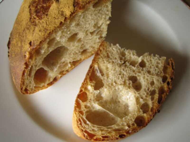 ペイザンはこうばしく、空気のように軽いカンパーニュ。使われる小麦粉は石臼で挽かれ、和三盆のような色をしています。製法はポーリッシュ法。(液種を作り、長時間かけて一旦発酵させてから他の材料とミキシングする製法。) 「最近ではユーロタイプの粉が手に入るようになってきて嬉しいんですよ。パンが面白くなってきました。」とブロートハイムの明石さんが言っておられたのは、2003年秋にわたしが初めてのペイザンに感動していた頃。今はその粉を店の地下にある特注の石臼で時間をかけて挽いています。その前で「ずっと見ていても飽きないんですよ。」と本当に楽しげだった明石さん。またひとつブロートハイムの魅力を見た気がしました。