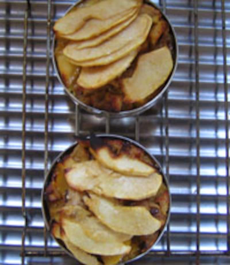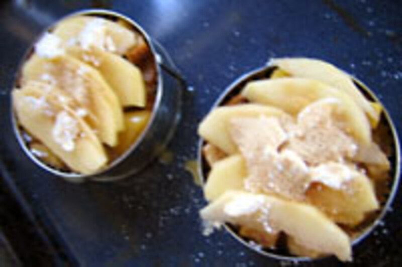 型の内側にバターを塗って3を入れ、4を載せて、仕上げに小さくちぎったバターときび砂糖を載せ(写真中)、180℃のオーブンで約20分焼く。
