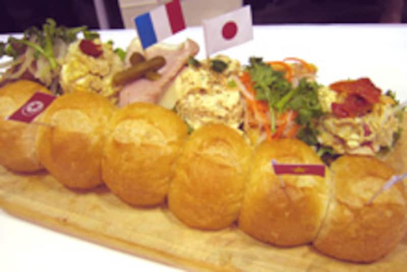 イタリアは卵サラダ、ベトナムは卵焼き、日本はツナサラダ、チュニジアはクスクス、フランスはハムチーズ、アメリカはローストビーフ |