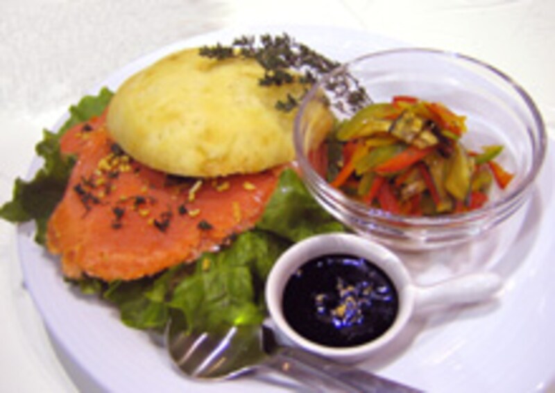 フォカッチャに冷たいサーモンと熱々の野菜ソースの融合 |