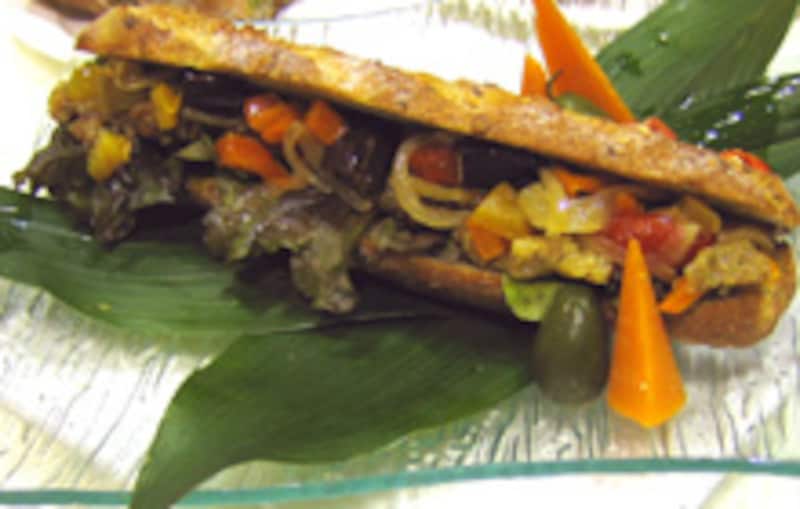 ソーセージと粒マスタードのフランスパンにいろいろな野菜とヴィネグレット |