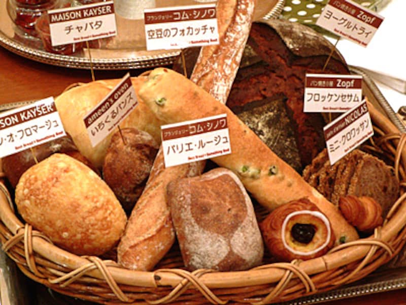 ベストパンと「何かとてもいいもの」の準備 テーブルの中央に置かれた各店のパン ベストパン★2004の上位10位にランクインした全店からパン、惣菜などが取り寄せられ、大きなテーブルに並びました。パンはこのイベントのために特別に焼かれたものもあれば、パン屋さん自ら持ってこられた焼きたてもありました。 それを最高の状態で提案できるよう、リベイク、カットについて打合せを重ね、 パンに合う食材(Something Best)については、パン屋さんを通じて知った食材から店を選び、直接相談して決めていました。   テーブルに並んだ各店のパンや惣菜 パン焼き小屋Zopf VIRON メゾンカイザー ameen's oven チクテベーカリー PAIN D'ARTISAN NICOLAS ブランジュリ タケウチ ブランジェリーコムシノワ PAUL アンデルセン 【Something Bestご協力店】 大山ハム株式会社 株式会社久田 ロッテガロンヌ商会 農事組合法人 共働学舎新得農場   ゲストへのお土産 ゲストへのお土産として、人気ベーカリー御用達の大山ハム、チクテベーカリーの焼き菓子、各店の資料を用意しました。 それでは"Best Bread+ Something Best"の内容をご覧いただきましょう。 |