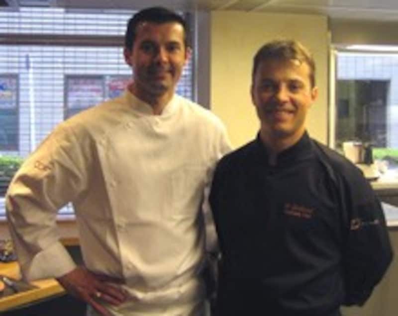 製パン技術指導はセバスチャン・セルヴォー氏(写真左)。グループ・アラン・デュカスの複数のレストランで勤務後、ADFでパティスリーを担当するシェフです。 パンの考え方や食べ方の提案はクリスチャン・ジュリヤール氏(写真右)。モナコの「ルイ・キャーンズ」、パリの「プラザ・アテネ」など、15年以上アラン・デュカスの元でキャリアを積んだシェフです。 |