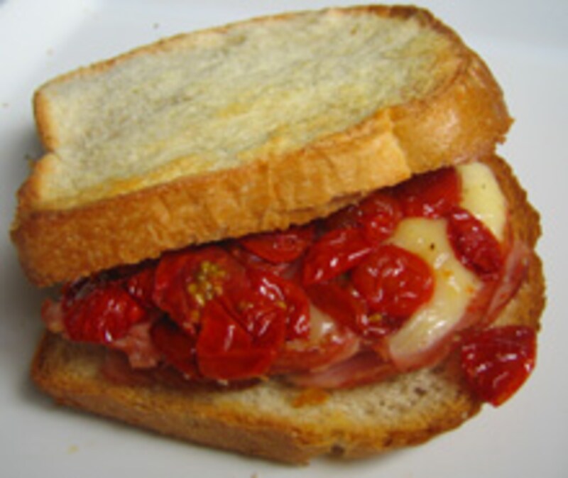 ハムとチーズをせて焼いたトーストに、黒胡椒を挽いて、たっぷりの セミドライトマトを挟みます。